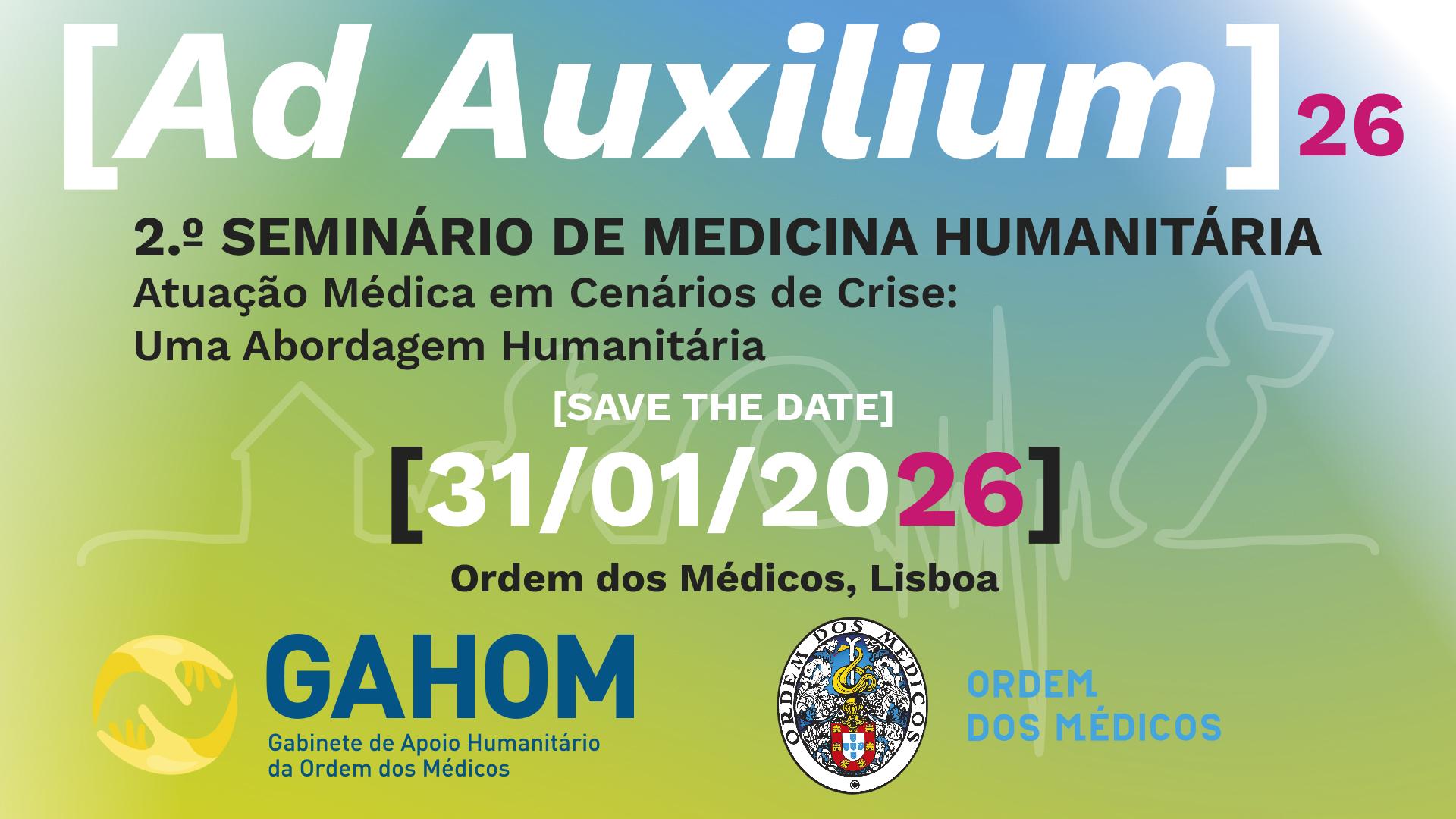 No dia 31 de janeiro de 2026, o Gabinete Humanitário da Ordem dos Médicos (GAHOM) realiza o 2º Seminário de Medicina Humanitária - [Ad Auxilium]26, que terá como tema Atuação Médica em Cenários de Crise: Uma Abordagem Humanitária.