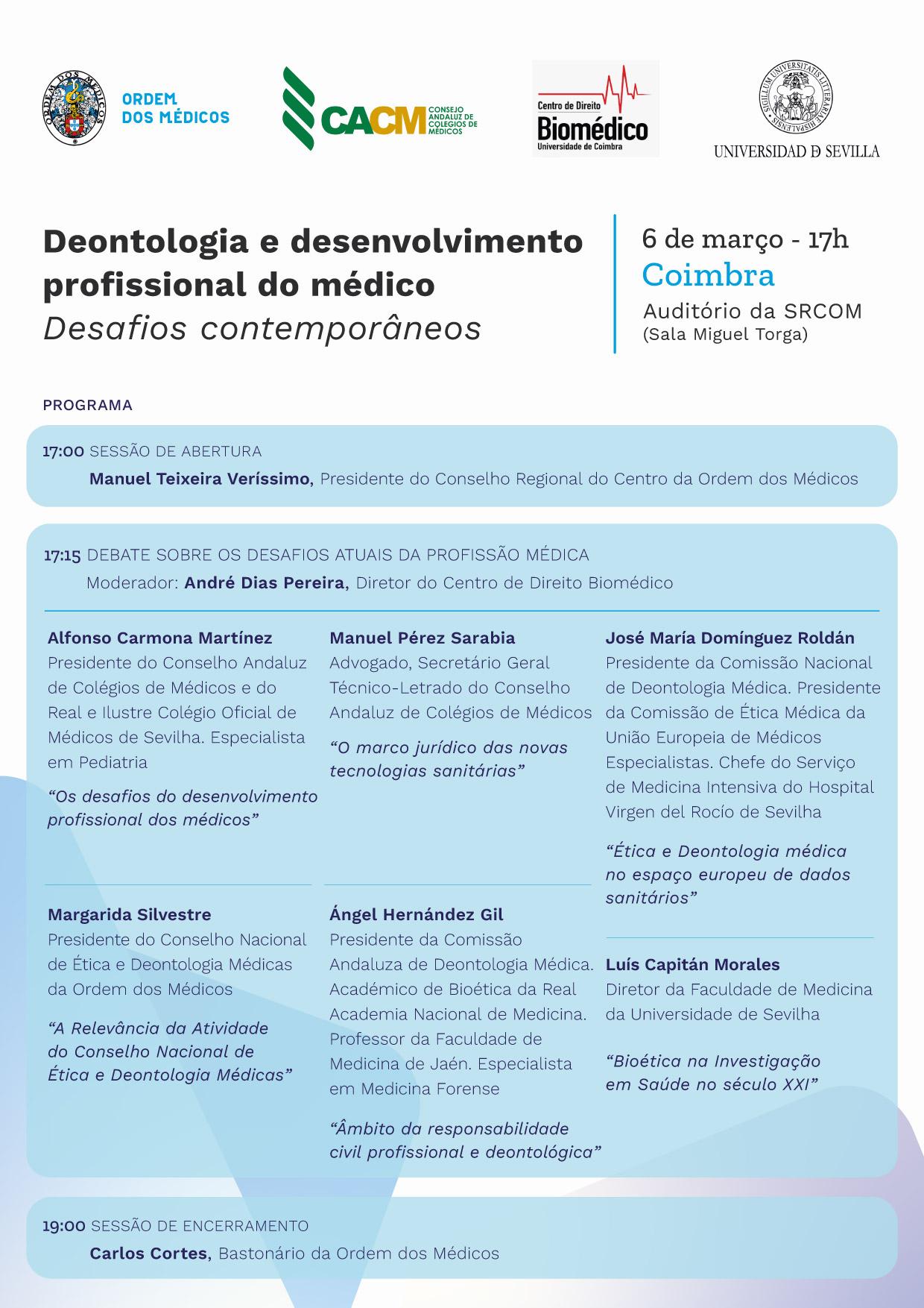 A Ordem dos Médicos organiza, em parceria com o Centro de Direito Biomédico, o debate “Deontologia e desenvolvimento profissional do médico. Desafios Contemporâneos“, que se irá realizar no dia 6 de março (quinta-feira) às 17h, no Auditório da Secção Regional do Centro da Ordem dos Médicos (Sala Miguel Torga), em Coimbra.