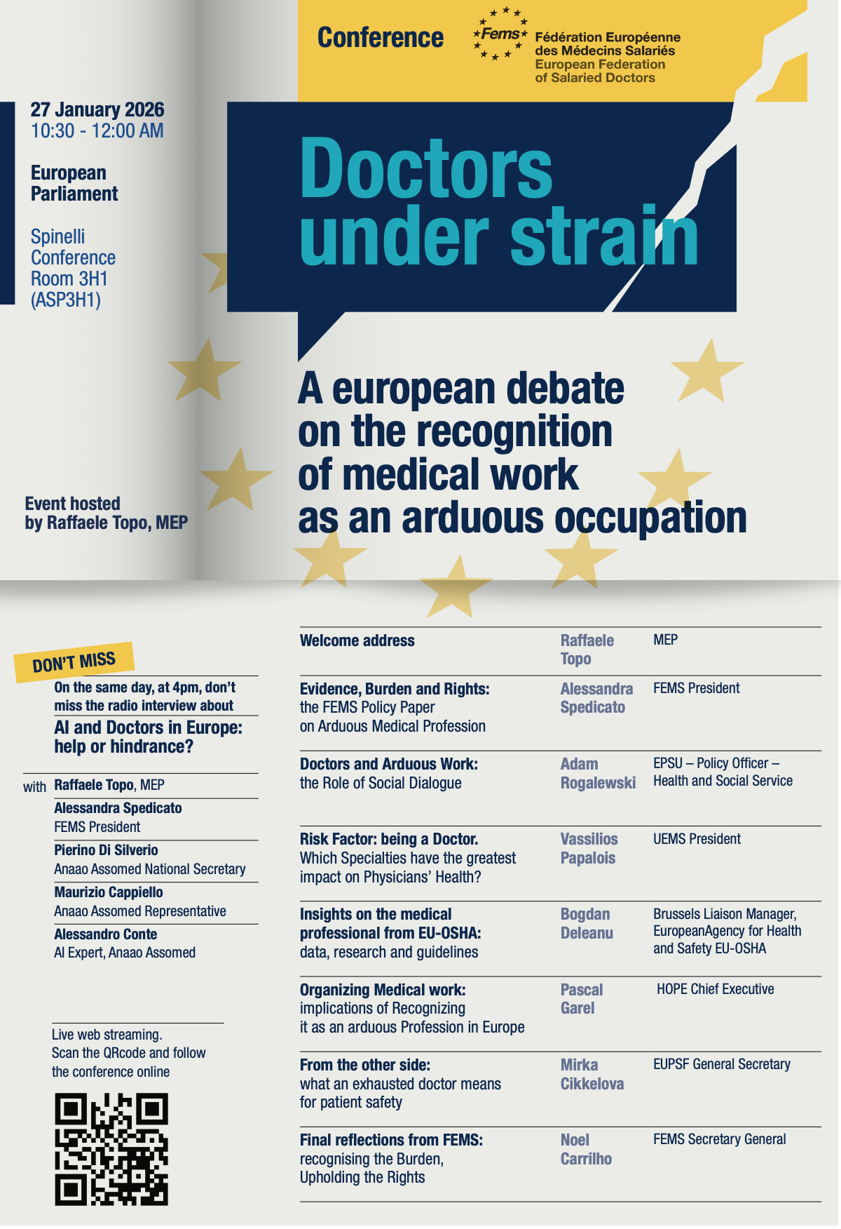 João Redondo, coordenador do Gabinete Nacional de Apoio ao Médico, assistiu à reunião da FEMS no passado dia 27 de janeiro de 2026, em representação da Ordem dos Médicos. O Parlamento Europeu, em Bruxelas, acolheu a conferência "Doctors under strain", organizada pela FEMS, com o objetivo de promover o reconhecimento formal do trabalho médico como profissão de elevado desgaste e risco (“arduous occupation”).