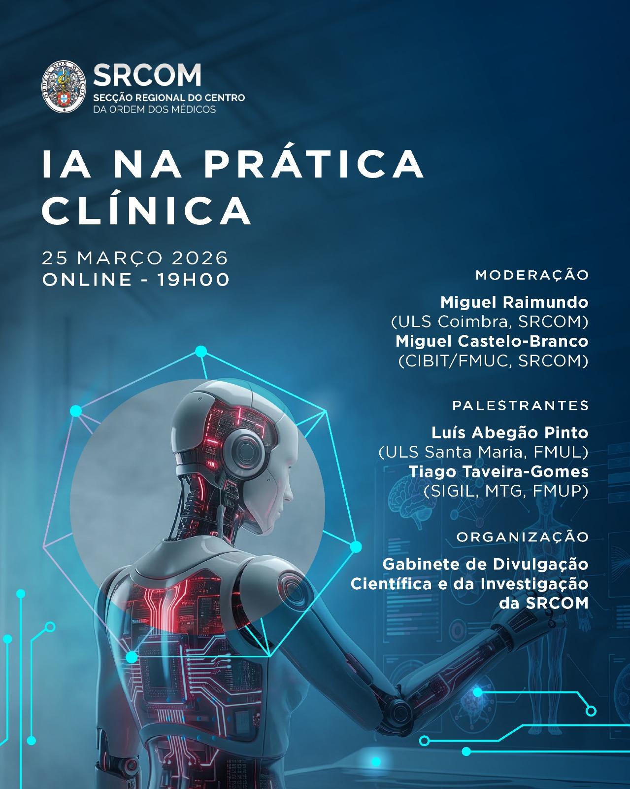 A Secção Regional do Centro da Ordem dos Médicos (SRCOM), através do Gabinete de Divulgação Científica e da Investigação, vai organizar, no próximo dia 25 de março de 2026, às 19h00, um webinar subordinado ao tema “IA na Prática Clínica”, que decorrerá em formato exclusivamente online e terá a duração máxima de uma hora.